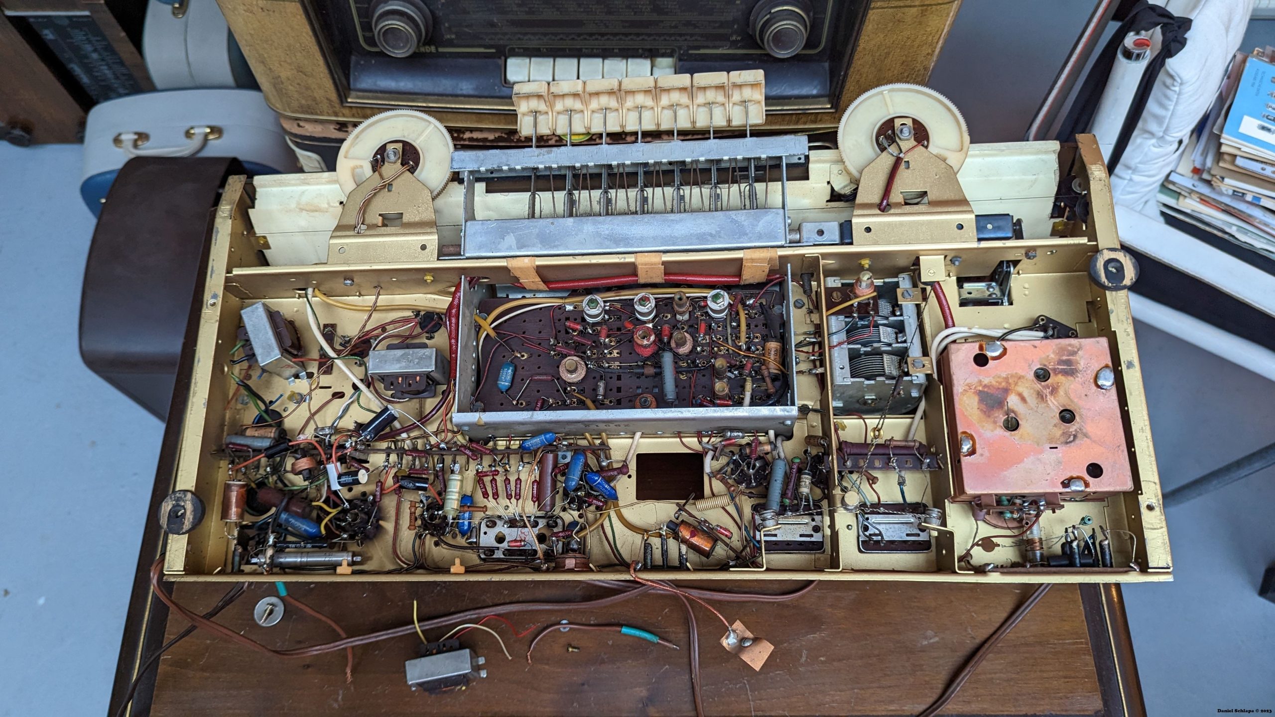 Er schraubt das Radio auseinander, versuchte es zu reparieren, aber es funktionierte nicht mehr.